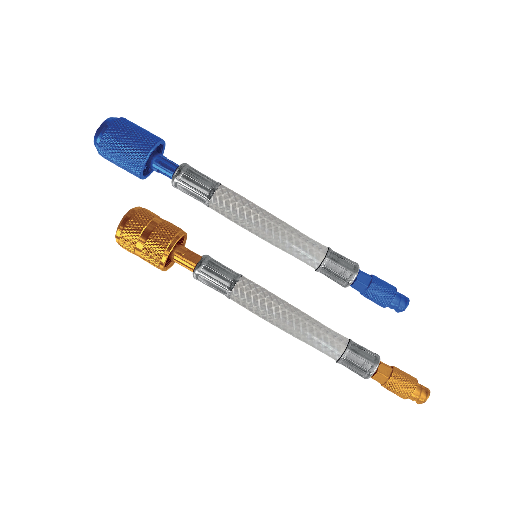 Two flexible hoses with SAE 1/4" and 5/16" fittings are included, enabling quick connection to the main service ports of HVACR and automotive systems, making operation easier even in restricted spaces.