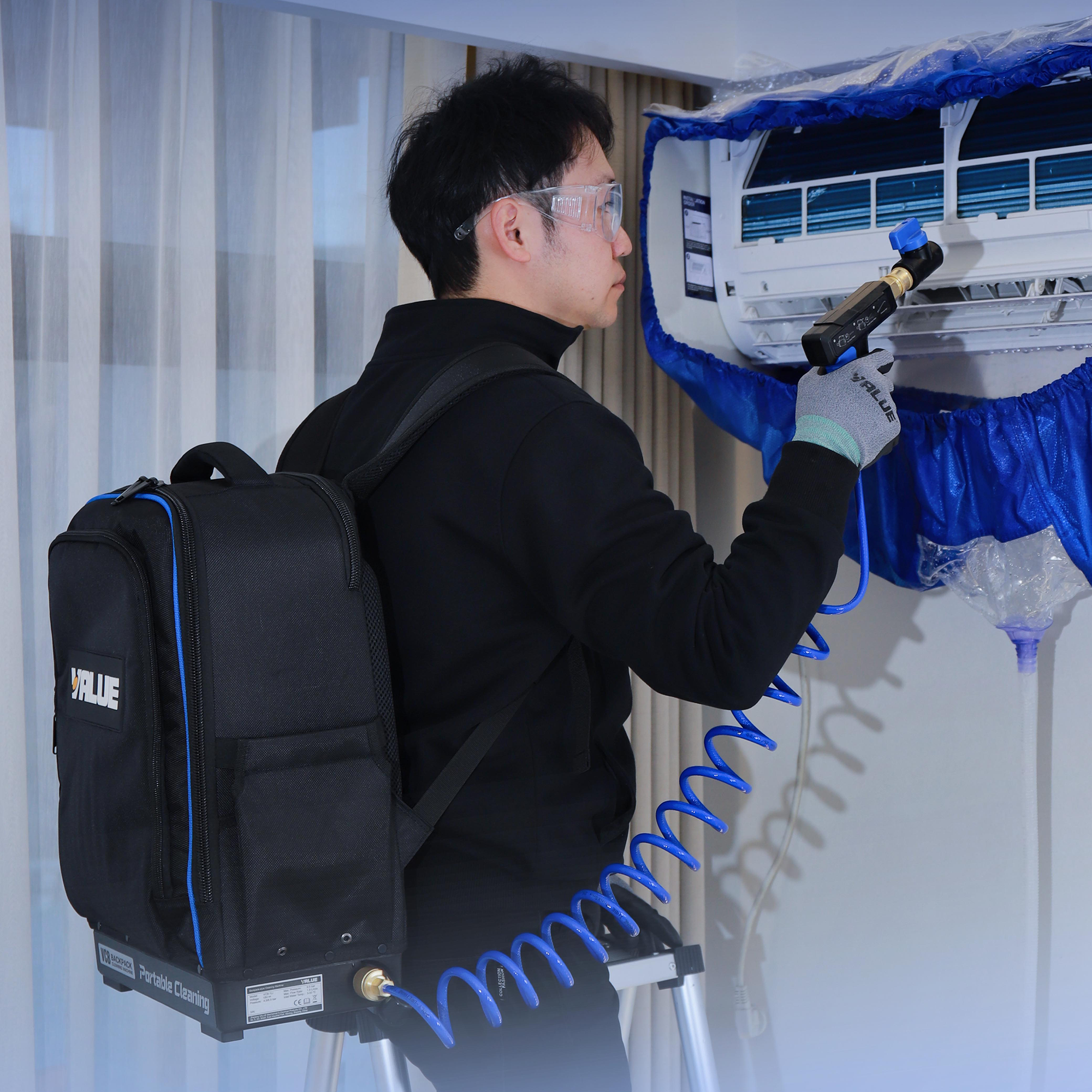 The backpack design keeps both hands free while moving between units. The two selectable pressure settings (4.5 / 6.5 bar) allow the output to be matched to the sensitivity of the component being cleaned — from delicate fin coils to surfaces requiring more intensive washing. The 25° fan spray nozzle ensures even coverage even in hard-to-reach areas; straight jet mode (0°) is available for targeted close-range work.