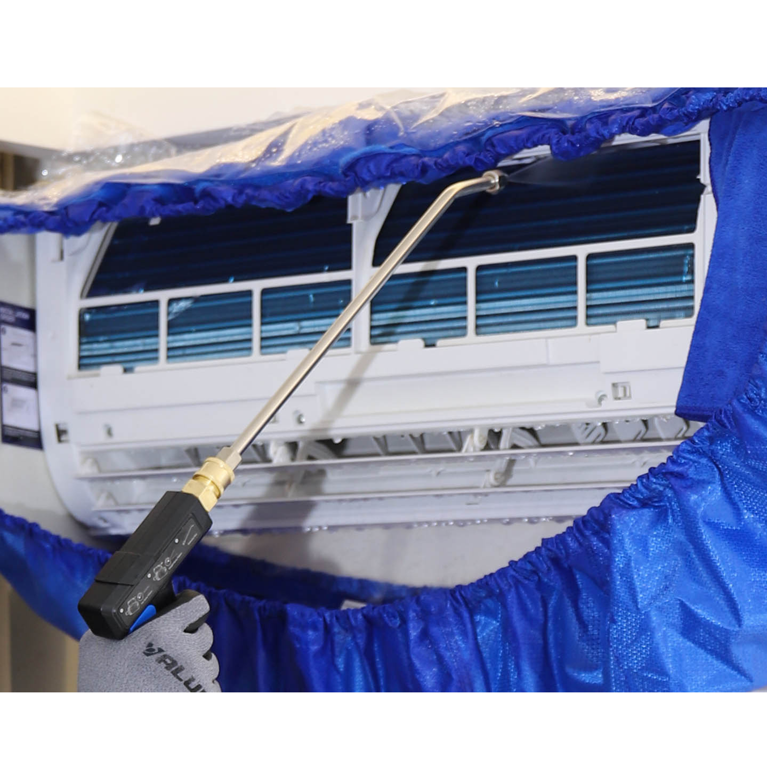 Cleaning of indoor and outdoor units of air conditioners, heat pumps, and refrigeration systems. Suitable for routine and non-routine maintenance in locations where access to mains water or power outlets cannot be guaranteed.