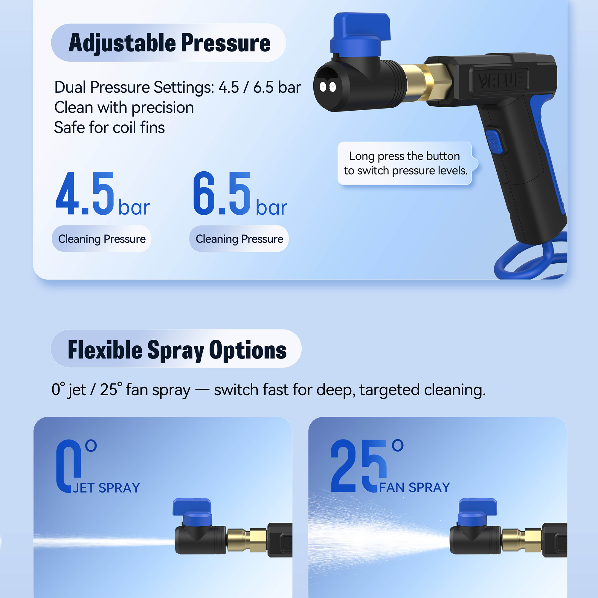 Two spray patterns: 25° fan spray and 0° straight jet